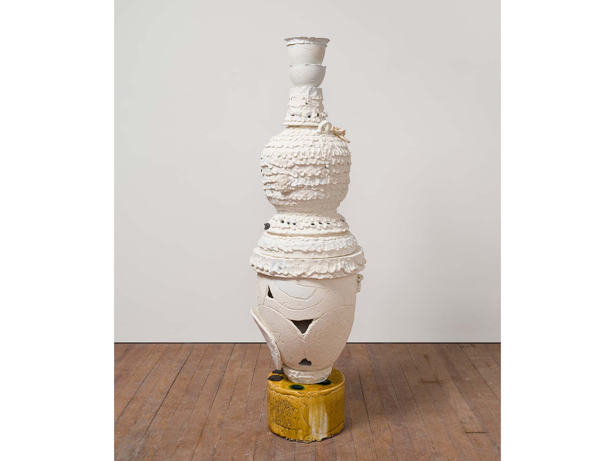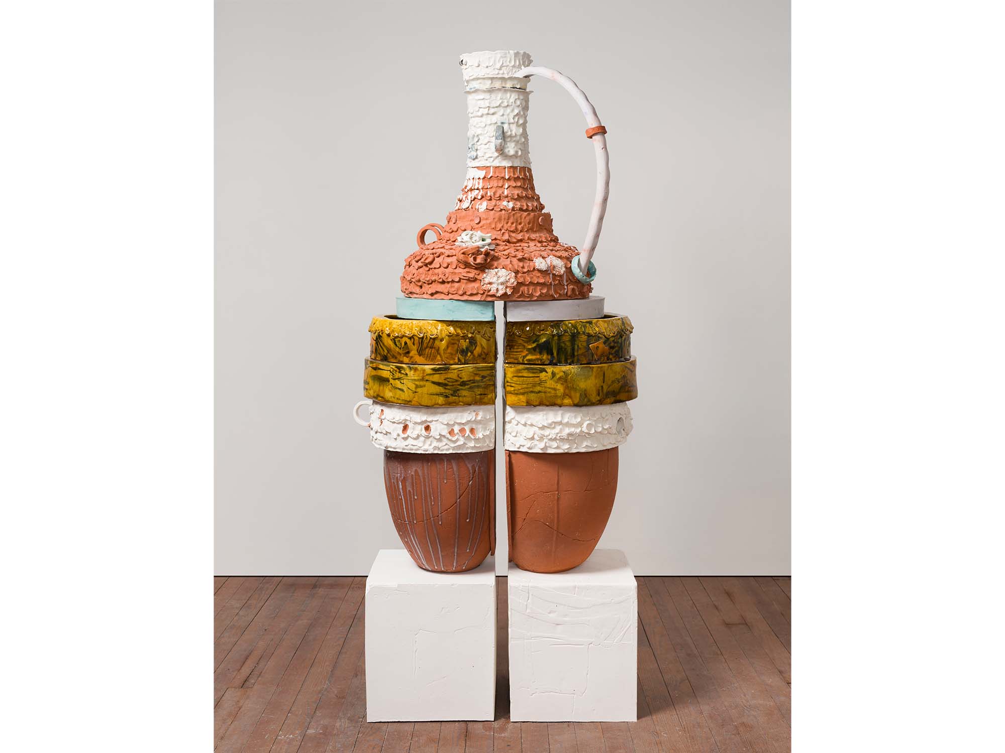Friedman Benda is pleased to present Hotel Roma, its first exhibition with the New York-based artist Nicole Cherubini. An influential figure in contemporary sculpture, Cherubini is widely known for her monumental works, which she primarily builds in clay by hand and layers with color, texture, and sculpted detail. New to her work is the inclusion of complex figurative elements which are integrated into the larger form, evoking the imaginative excess of baroque and surrealist art. This applied iconography is rich in narrative and historical reference, reflecting Cherubini’s erudition both within her own discipline and beyond.