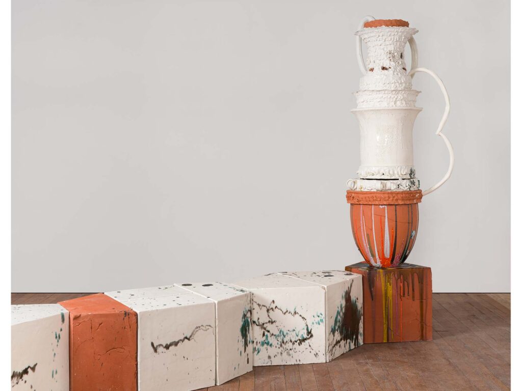 Anchoring Cherubini’s exhibition at Friedman Benda are a trio of works that she calls the Three Graces, a classical typology that she infuses with new and vigorous life. Bypassing more familiar versions from art history (Botticelli, Canova, and many others), she has returned to ancient Socratic texts in which these allegorical figures are taken to represent acts of generosity: bestowing, receiving, and returning. Each of the three sculptures has a strong compositional personality of its own: one, for example, is conjoined to a ceramic bench over ten feet long, extending across the gallery floor. Made principally of terracotta and white earthenware, these works are polymorphous in their structural components – Cherubini remarks that they “look like the love children of Brancusi and Frankenstein” – and are completed with glazes in turquoise, amber, emerald, white, and metallic luster, recalling the palette of both Italian majolica and modernist abstract painting.