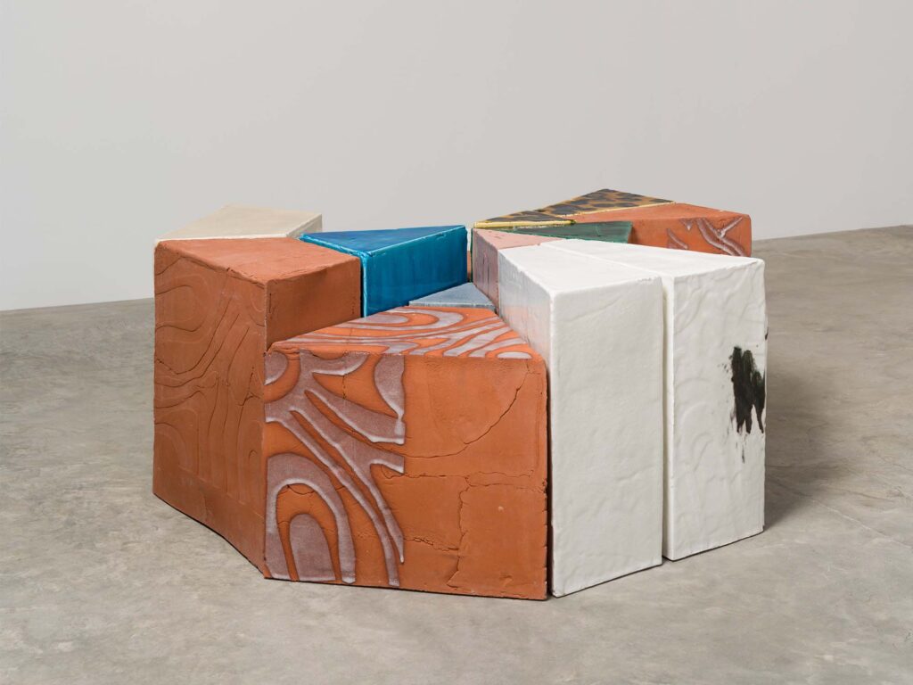 Cherubini’s bricolage approach is also seen in Butterfly, inspired by a lyric of Erykah Badu (“Maybe we’ll be butterflies / I guess I’ll see you next lifetime”). With its double form, the sculpture does suggest a gorgeous, winged creature in flight, but it is also powerfully physical, a prodigious feat of forming, stacking, cutting, and conjoining. With its contrapposto stance and prominent arm-like handle, the work registers Cherubini’s recent collaborative work in staging choreography; despite its scale and solidity, it is filled with implied motion. Other works in the exhibition, including a major octagonal seating sculpture and a columnar form that responds to the existing architecture of the gallery, add to the sense that a dramatic performance is underway.