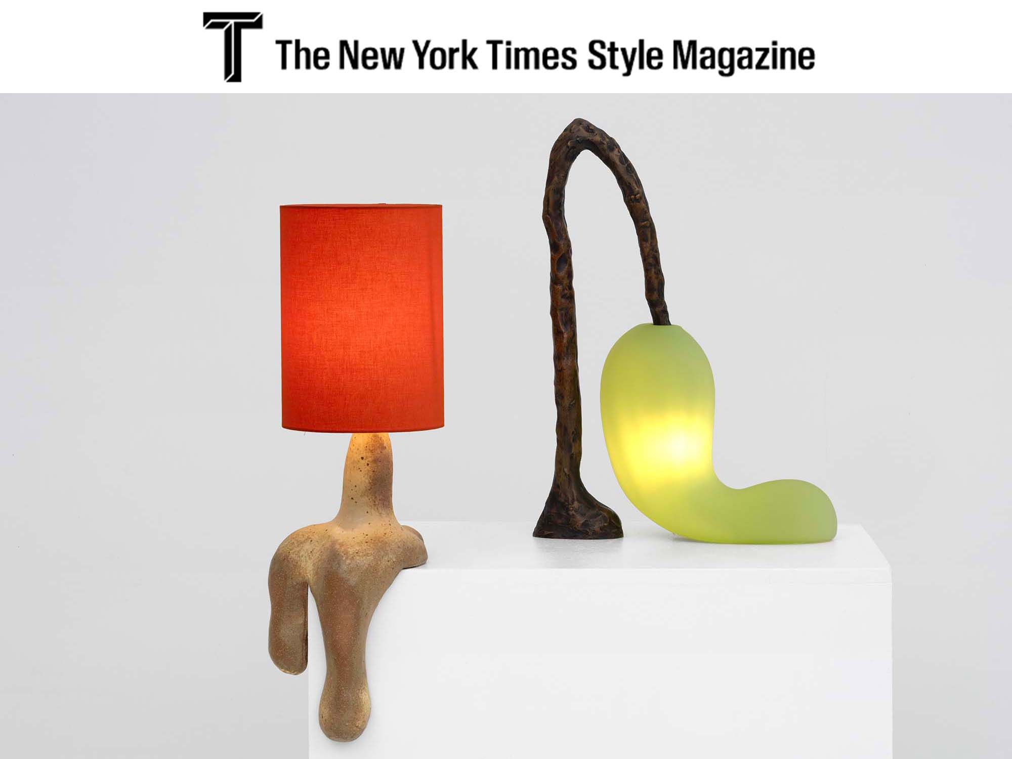 The Swiss artist Carmen D’Apollonio primarily makes sculptural lamps whose globular clay bases often cling to the corner of a table, their shades askew. She considers each one a character. This week, she’s debuting a new collection at Friedman Benda’s New York gallery, many of which feature glass lampshades. D’Apollonio says she likes that the material “drips and is unpredictable.” One of the new pieces looks like a glass mushroom; another resembles a person wearing a hat bent toward the ground, or maybe a drooping, bell-shaped flower on a thick black arched stem. Another new work incorporates fabric (D’Apollonio, who’s based in Los Angeles, was previously a fashion designer) stuffed to create a massive pillow in the shape of two legs, which forms the base of a wall-mounted light. “It’s my new baby,” says D’Apollonio. “Carmen D’Apollonio: Salut, Ça Va, C’est Moi” will be on view at Friedman Benda New York from Sept. 11 through Oct. 16, friedmanbenda.com.